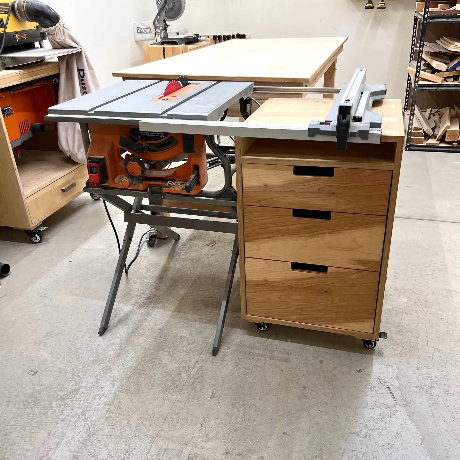 Store all your table saw accessories right where you use them — no more hunting for miter gauges, push sticks, or blades.