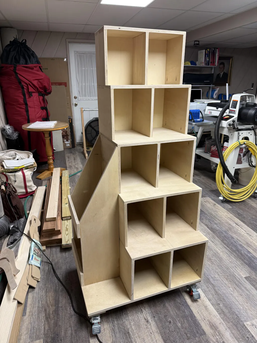 - Staggered Design: This design allows for minimal space to be taken up in your workshop while maximizing storage space for all lengths of scrap lumber. The depth of each cubby is as follows: 8" (205 mm [top]), 12" (305 mm), 16" (405 mm), 20" (510 mm), and 24" (610 mm [bottom]).